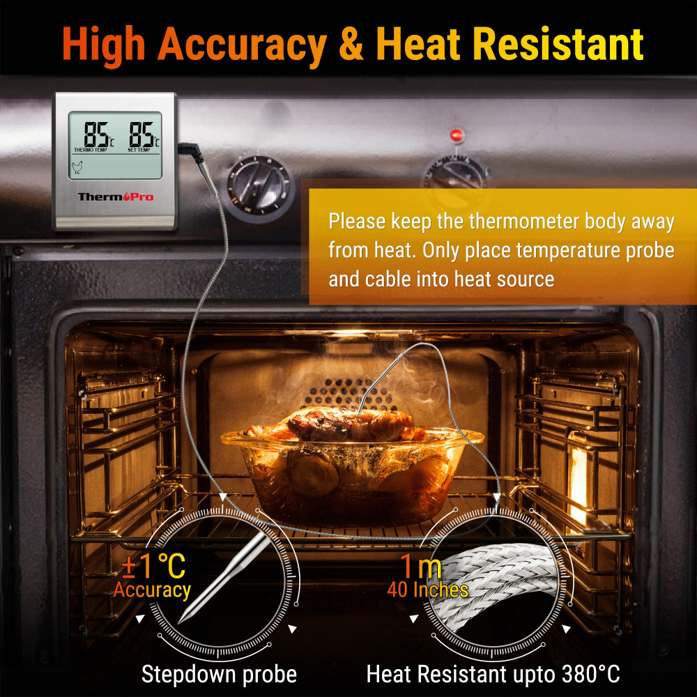 High accuracy and heat resistance: Meat probe and wire can withstand up to 716 degrees Fahrenheit, you can cook with wide temperature range from 32 to 572 degrees Fahrenheit (0 to 300 degrees Celsius) with high accuracy: 1 degree resolution, 1.8 degrees Fahrenheit/1 degrees Celsius