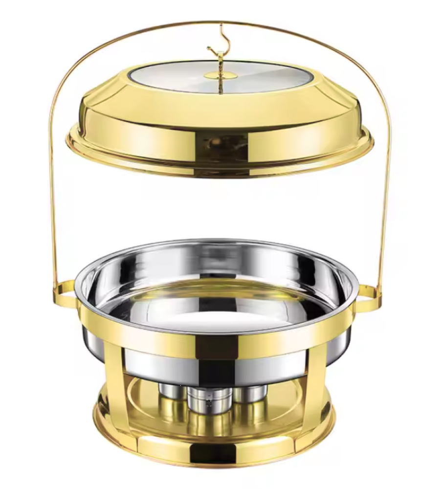 Serve warm and perfect food with this 20L buffet warmer, featuring an elegant hanging lid. The luxurious gold design adds a touch of sophistication to any event or restaurant. This warmer is highly efficient at retaining heat, making it perfect for large gatherings and hotels. The hanging lid allows easy access to food while keeping it organized.